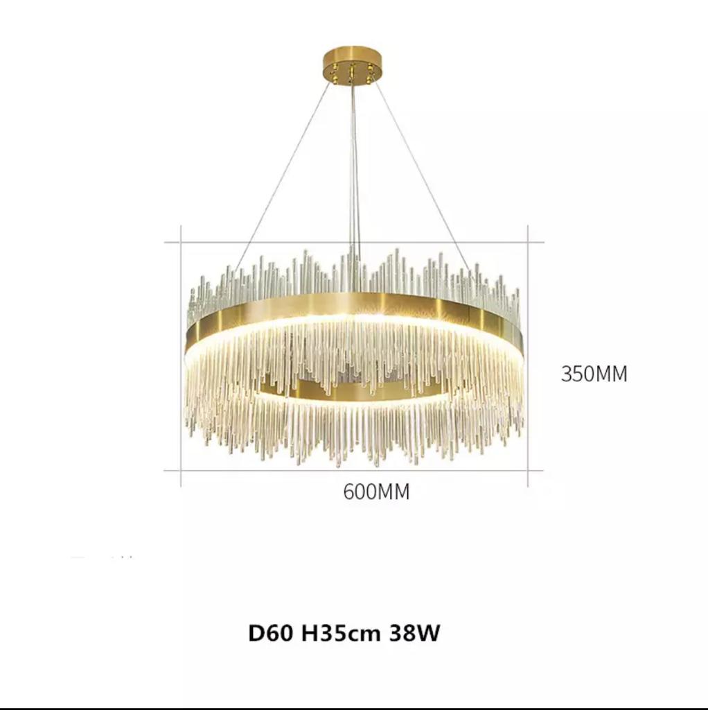 Illuminez votre intérieur avec l’élégance contemporaine de notre Lustre « Cylindres Lumineux ». Son design audacieux, composé d’un anneau doré central et d’une multitude de cylindres de cristal, diffuse une lumière à la fois vive et douce, créant une ambiance sophistiquée et accueillante.