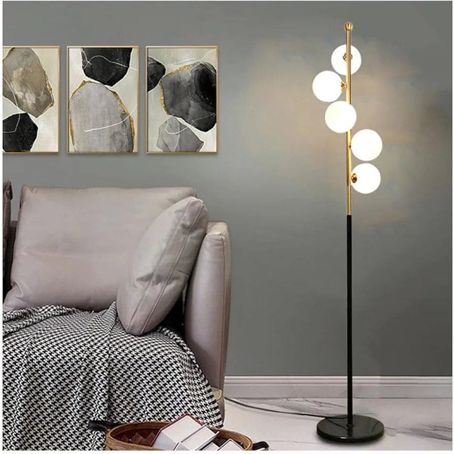 La finition dorée ajoute une luminosité subtile, faisant du lampadaire une pièce maîtresse décorative. Les boules en verre opalin ou en matériau translucide diffusent une lumière douce et uniforme, apportant une ambiance accueillante.