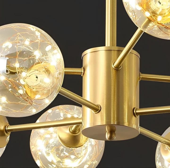 - Design : Moléculaire, fixation directe au plafond, finition dorée, globes en verre transparent avec lumière interne.